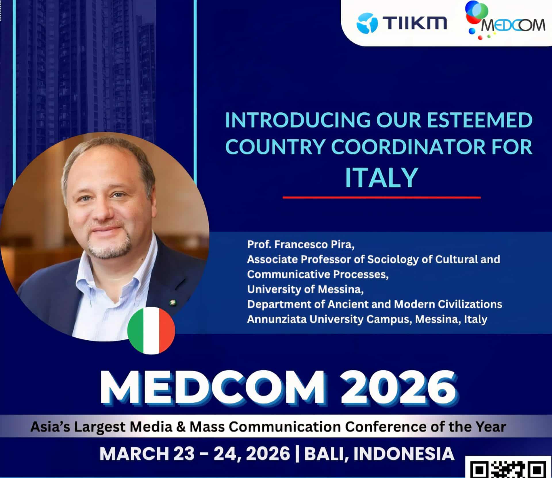 Francesco Pira, professore associato di sociologia dell’Università di Messina è stato confermato per il terzo anno di consecutivo Country Coordinator per l’Italia della conferenza internazionale MEDCOM 2026 che si terrà il 23 e 24 marzo a Bali in Indonesia (piattaforma ibrida sia in presenza che on line).